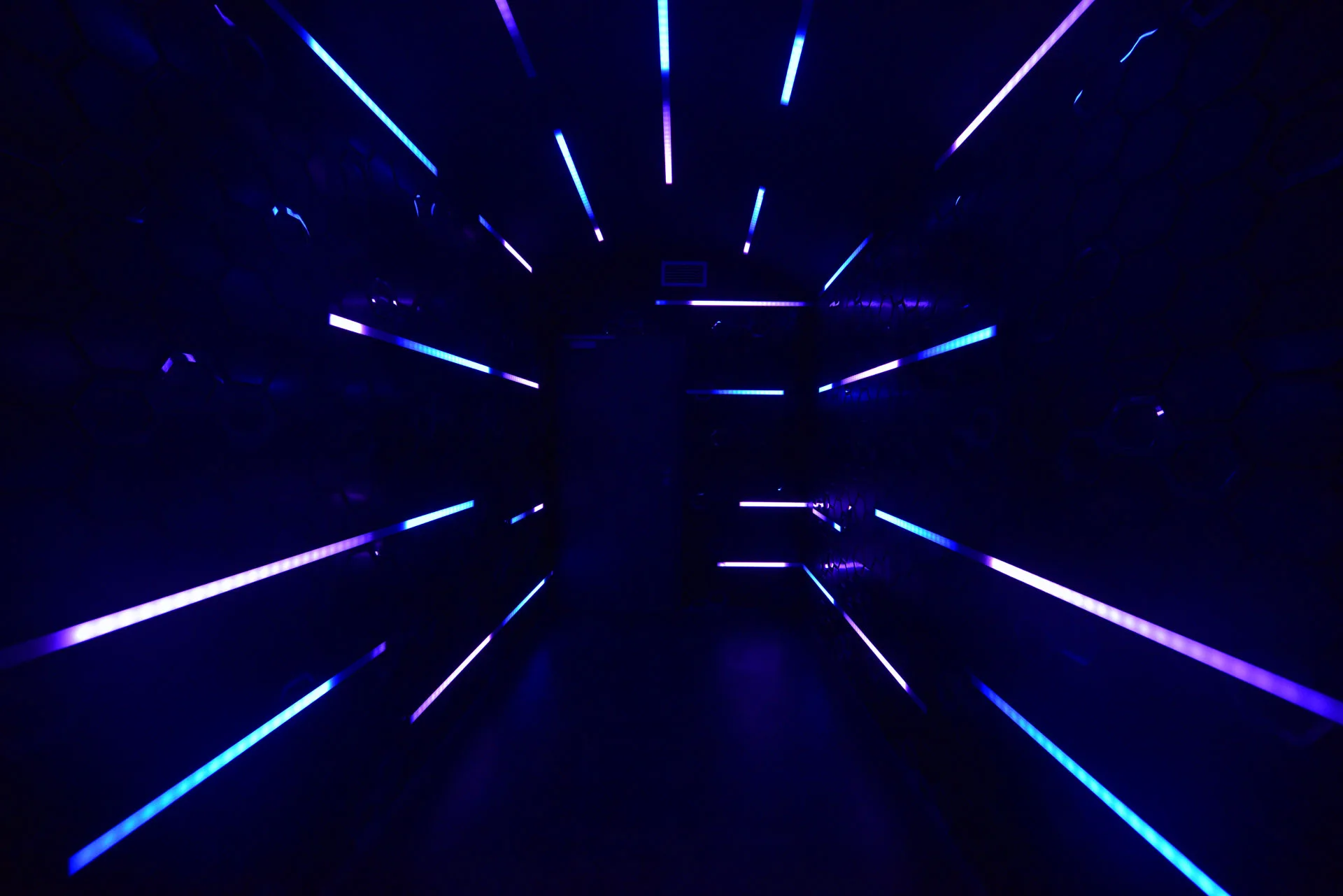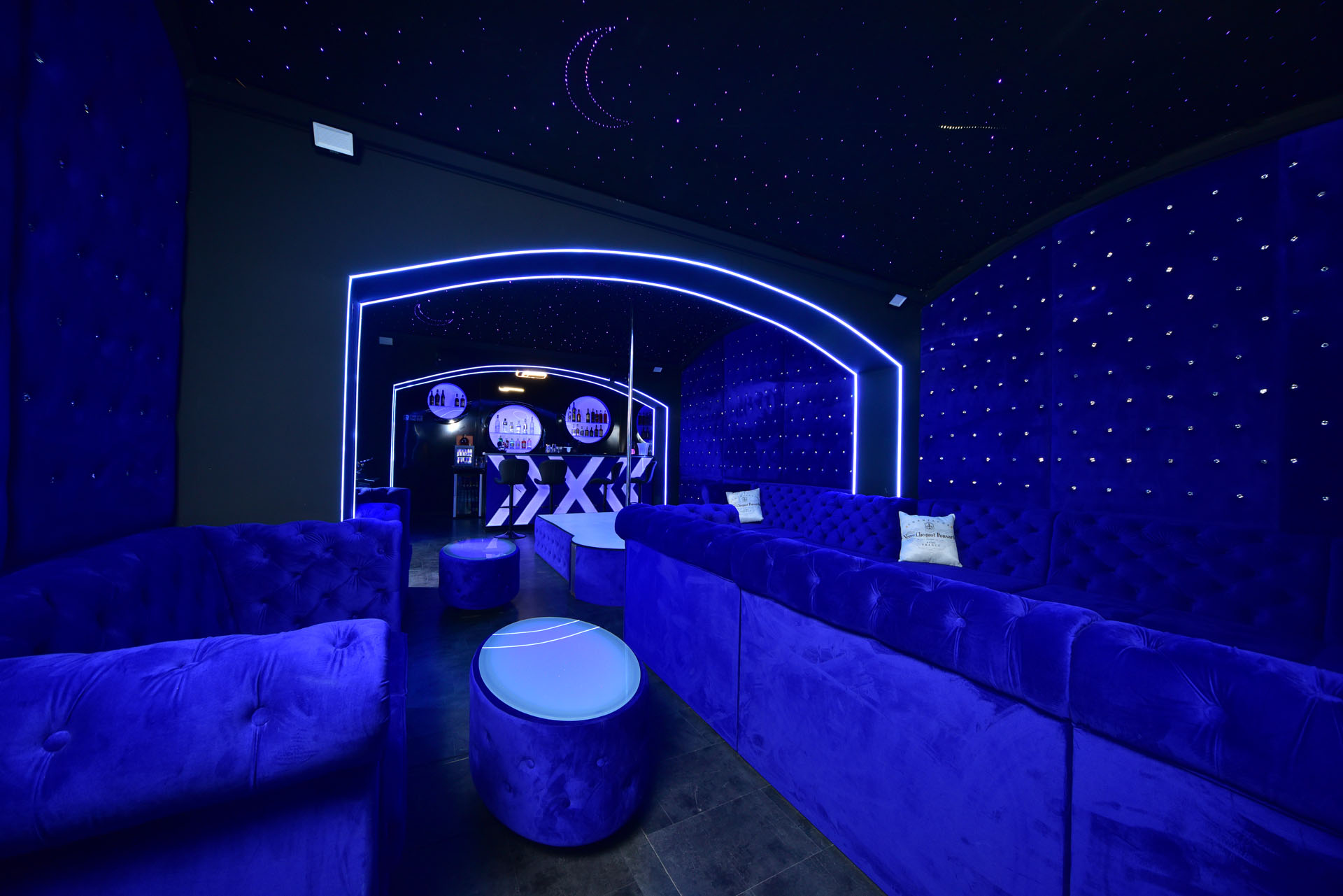 DJ pult, 2× taneční pódium, LED pásky ovládané systémem Madrix. Klub ponoříš do jakýkoliv barvy.